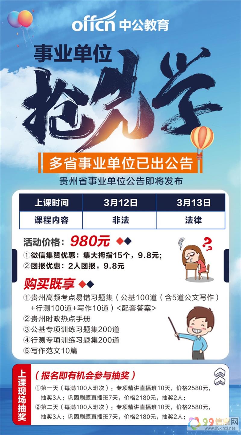 2020毕节事业单位干货抢先学4堂课,中公大咖师资授课原价980,两人拼团9.8主讲联考公基法律学科上课时间:3月12日-13日...